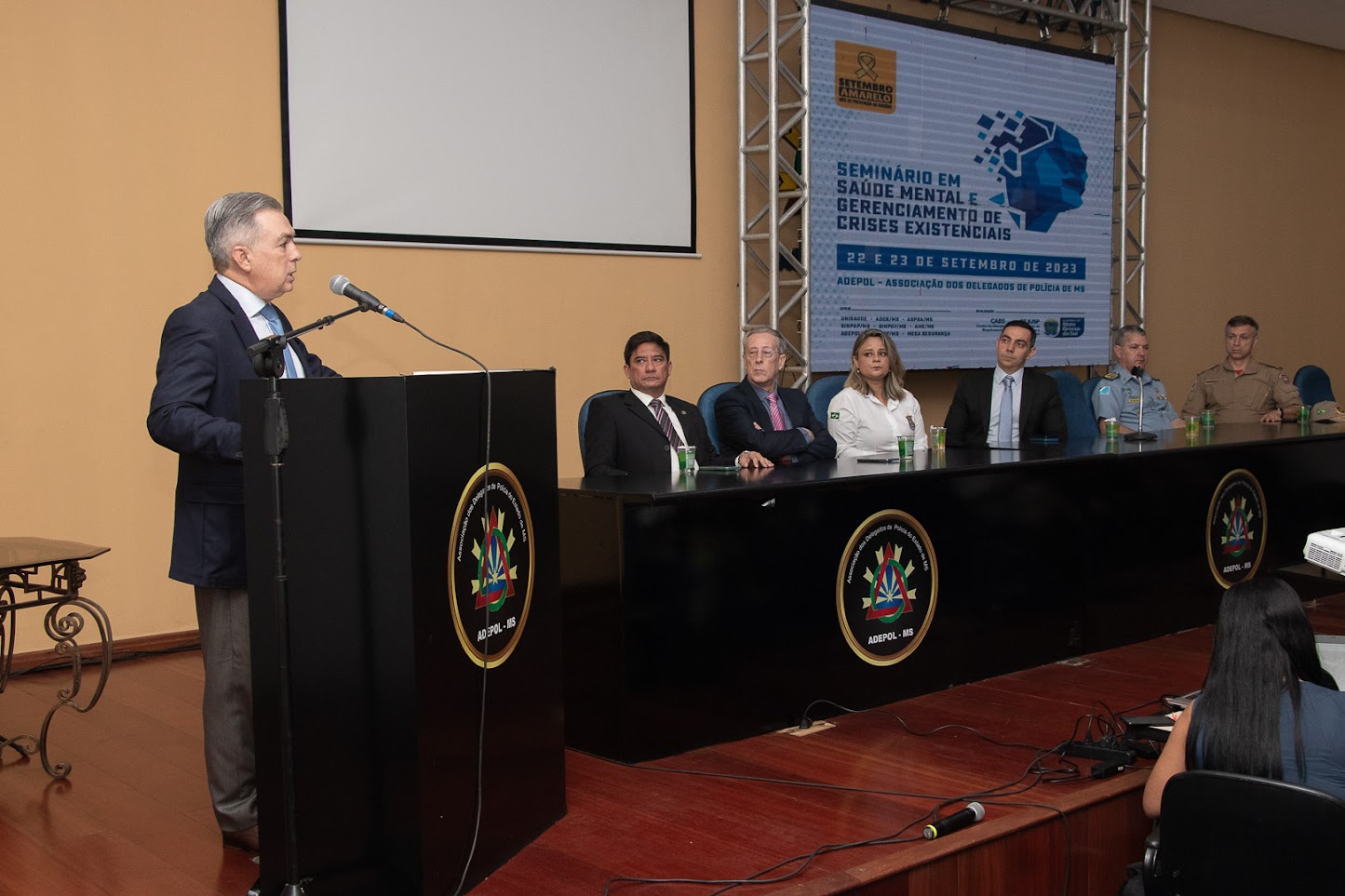 A abertura do seminário foi realizada, na Associação dos Delegados de Polícia de MS, e contou com a presença dos representantes das forças de segurança do MS e do secretário da Sejusp, Antonio Carlos Videira, que falou da importância do evento e de algumas das ações que a Secretaria tem realizado, visando a qualidade de vida dos profissionais da segurança pública.